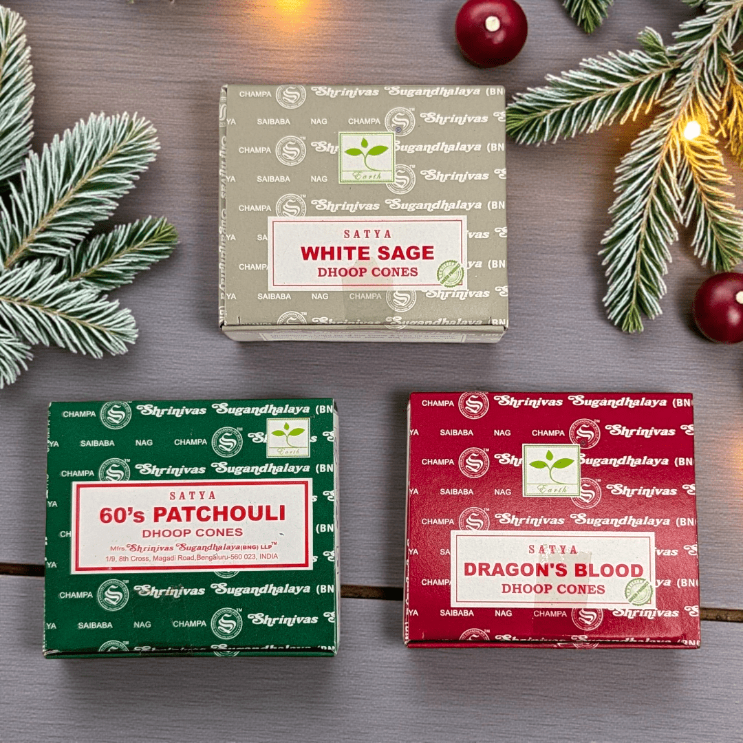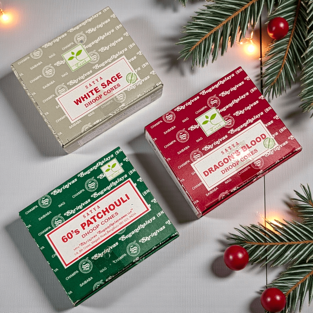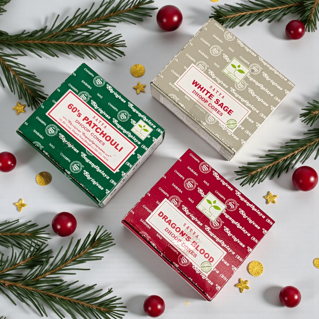 The Holiday Incense Cone Set brings together three of our most-loved Satya fragrances, bundled to create a warm, cleansing, and energetically supportive atmosphere for the winter season. Perfect for holiday rituals, cozy evenings, meditation, or clearing your home before gatherings, this set combines grounding, uplifting, and purifying scents in one intentional trio.