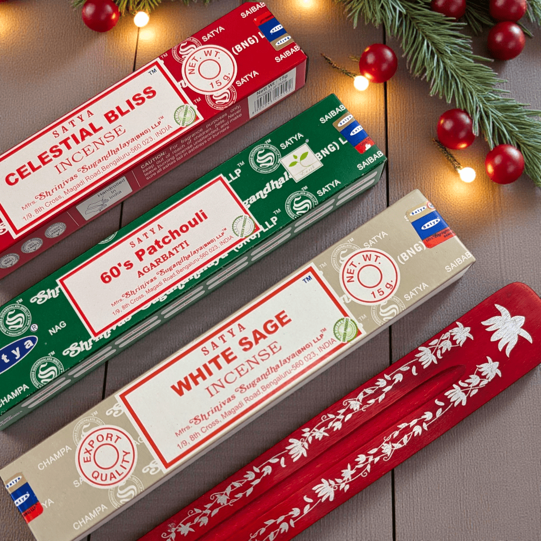 The Holiday Incense Gift Set is a warm, meaningful, and beautifully curated bundle created for anyone who loves incense, ritual work, or cozy holiday ambience. This set includes three full boxes of premium Satya incense sticks plus a wooden incense holder, making it the perfect ready-to-gift option for the season.