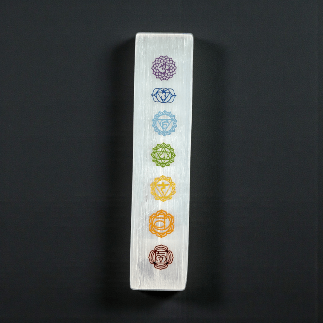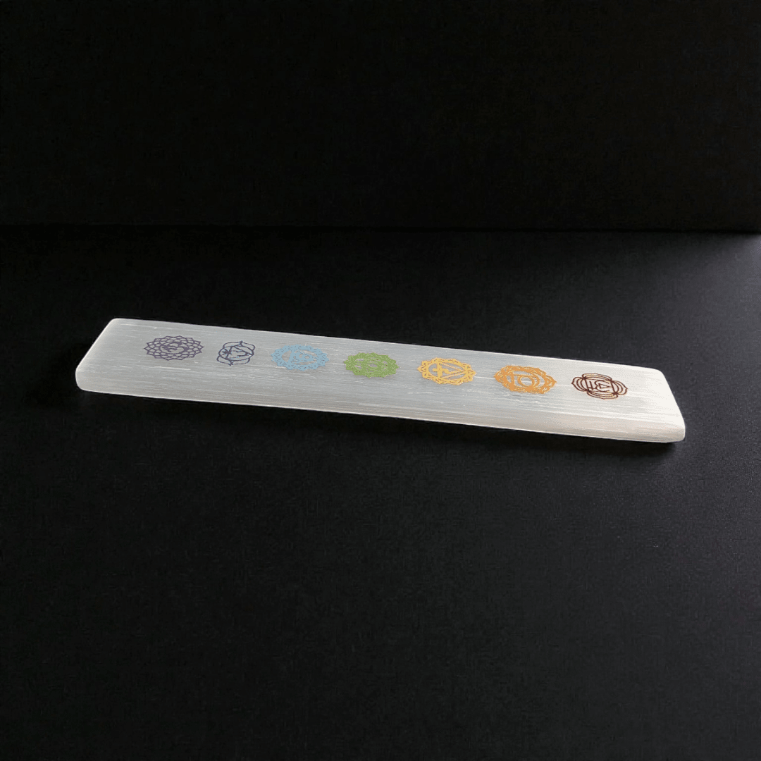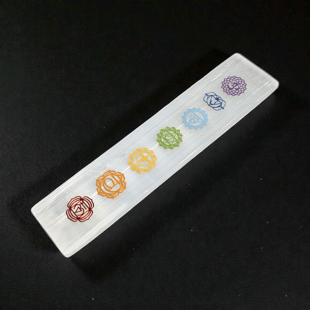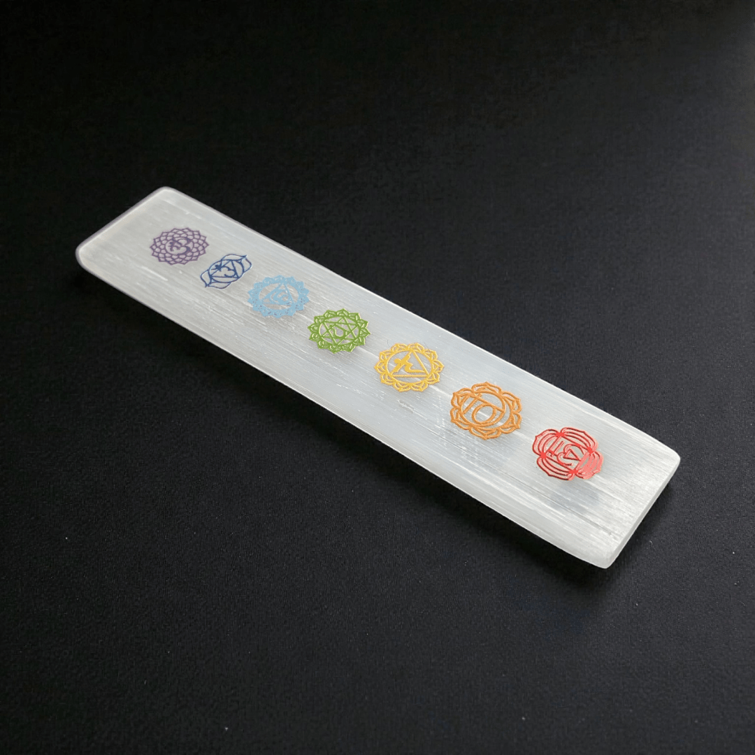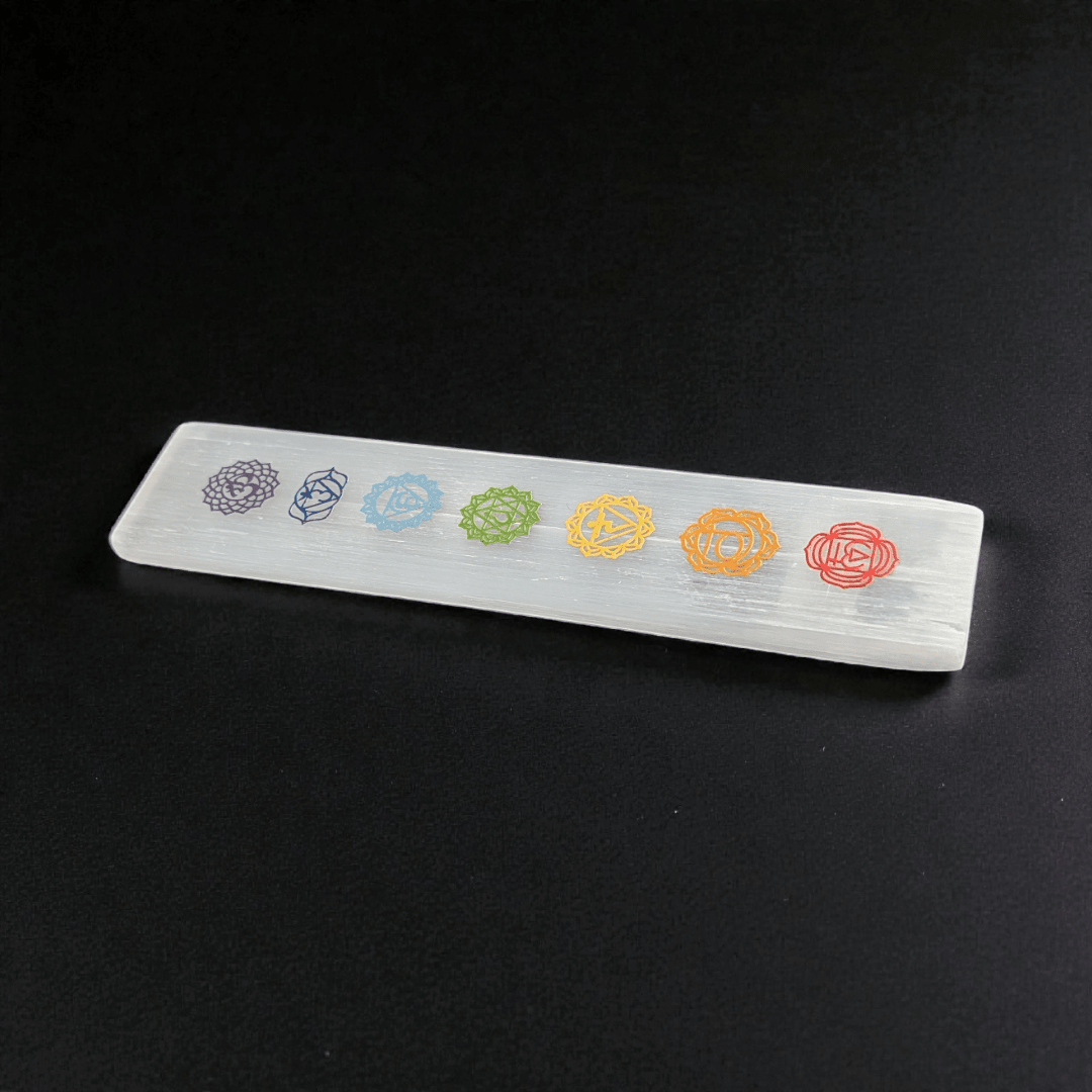 This Small Selenite Chakra Plate is designed for daily chakra reset and crystal charging. Featuring the seven chakra symbols across its surface, this 6-inch bar supports balanced energy flow while helping clear stagnant or scattered vibration from your space. Its elongated shape encourages full-body energetic alignment, making it ideal for jewelry cleansing, bedside placement, or altar setups.