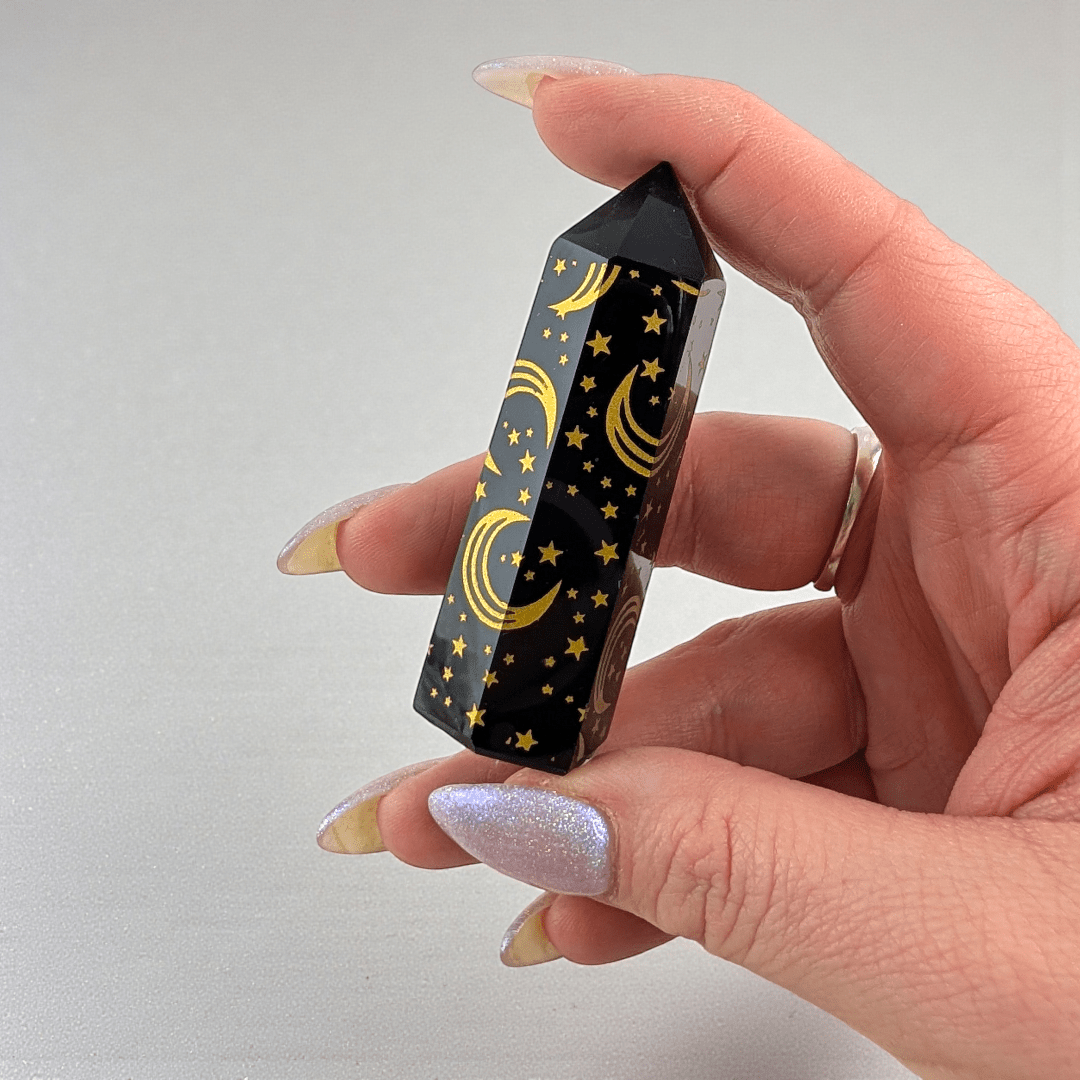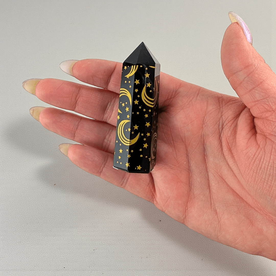 You will receive one tower intuitively selected from our collection. As natural Black Obsidian, expect authentic inclusions, minor surface variations, and slight differences in tone and carving detail. Color may vary slightly due to screen settings.