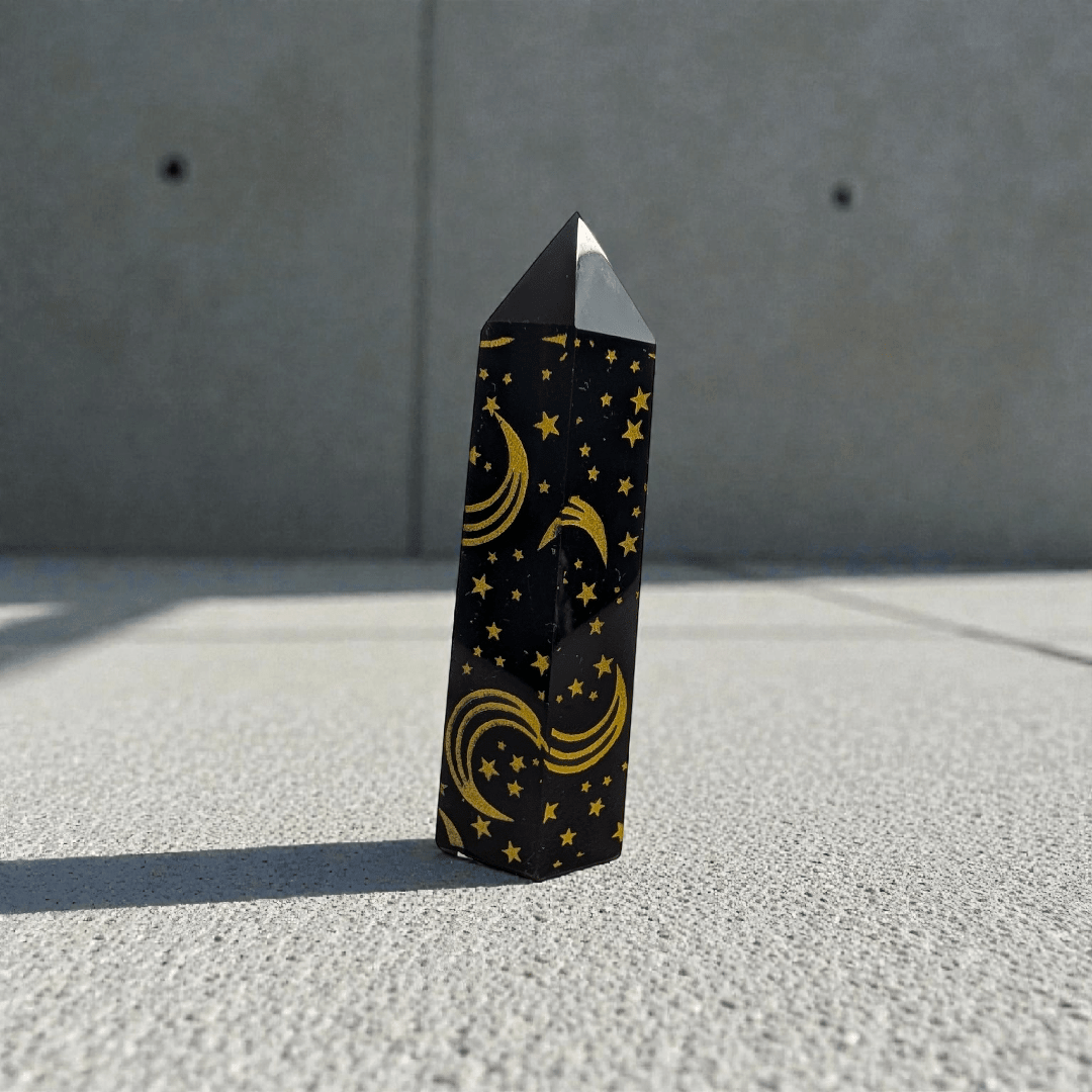 This Black Obsidian Engraved Tower acts as a boundary marker for your space and your energy. Obsidian does not soften truth — it stabilizes you while you face it. In tower form, its energy moves upward, helping to ground emotional intensity while clearing mental distortion. This piece is ideal for those who need protection from emotional drain, who struggle with absorbing other people’s moods, or who are learning to say no without guilt.