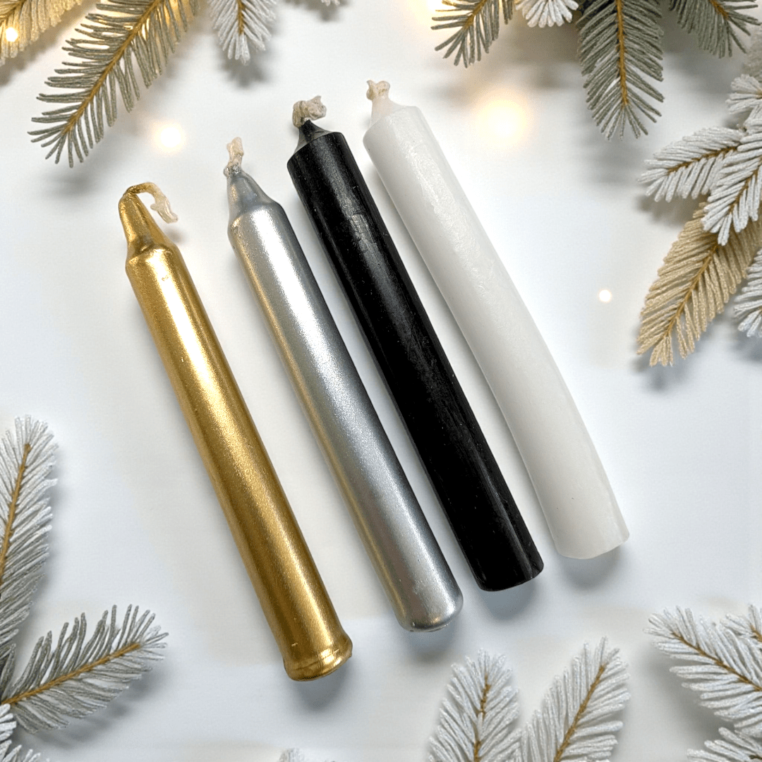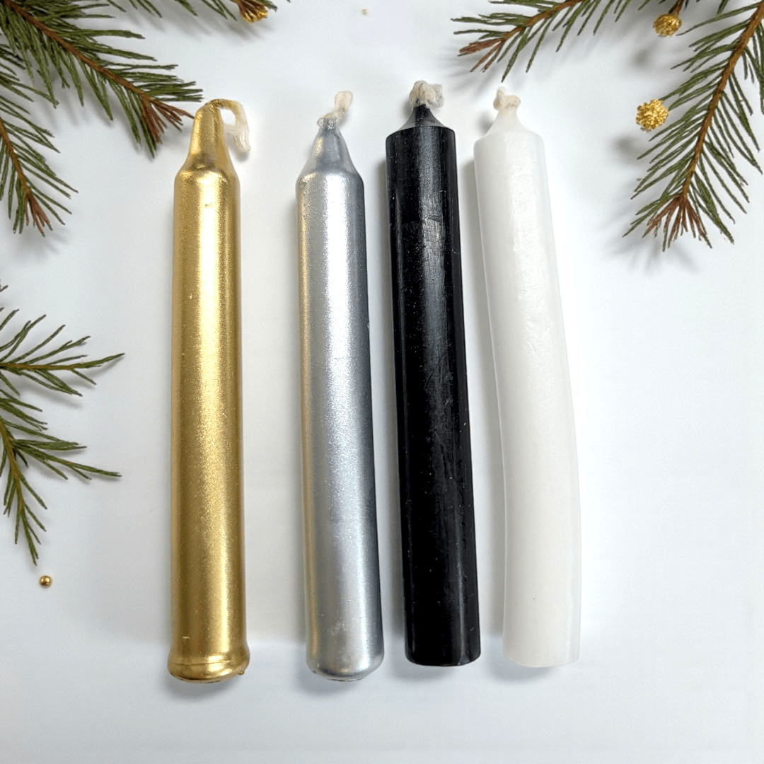• Set Includes: One Gold, One Silver, One Black, and One White candle