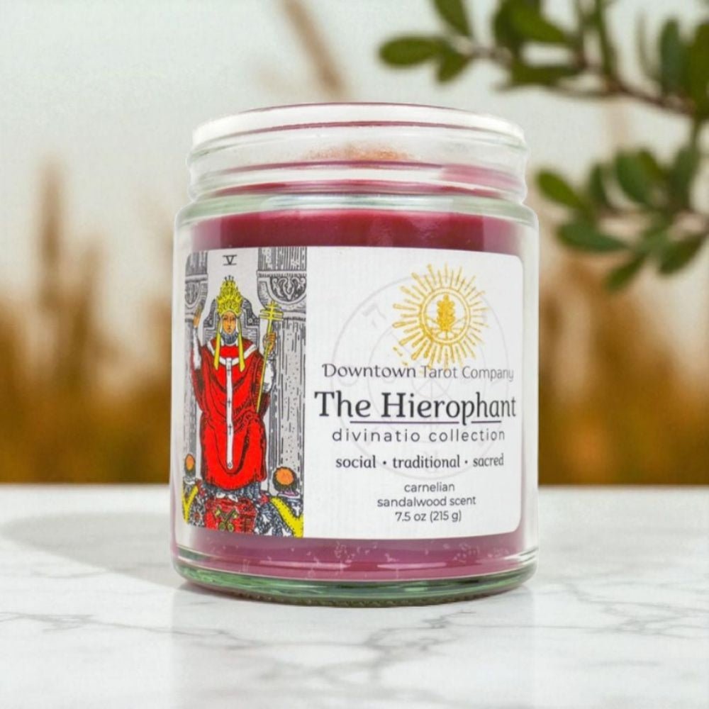 The Hierophant Tarot Candle strengthens your commitment to growth and honors the sacred lessons along the way. Red wax reflects discipline and stability, sandalwood scent promotes spiritual grounding, and an in-jar carnelian crystal adds courage and drive to follow your truth with integrity.