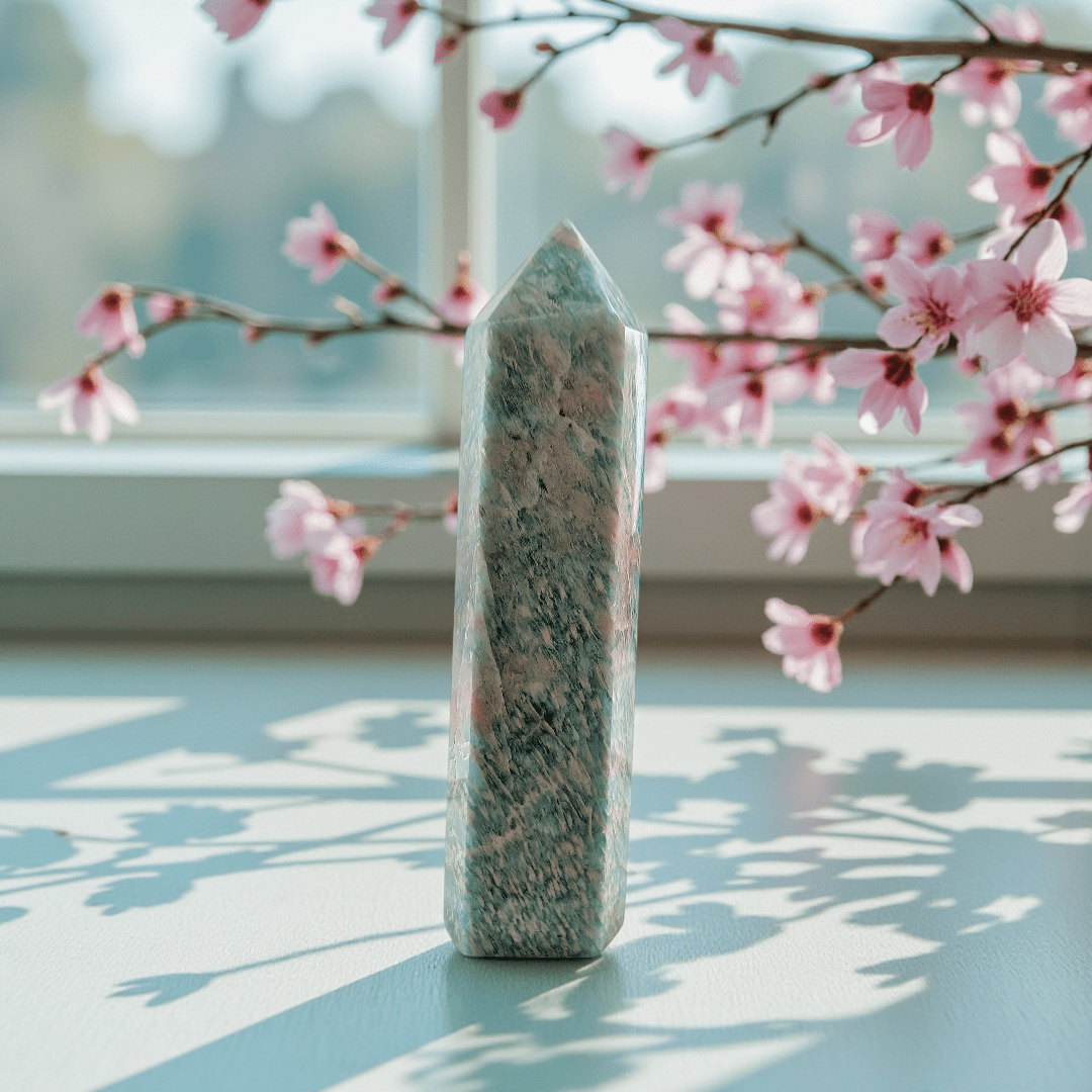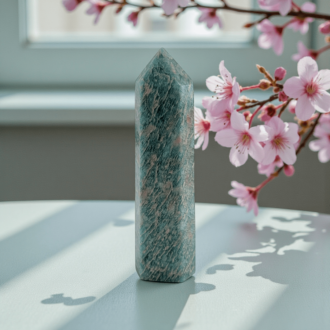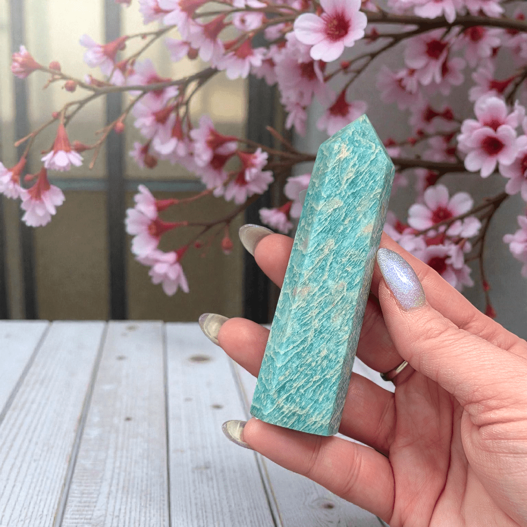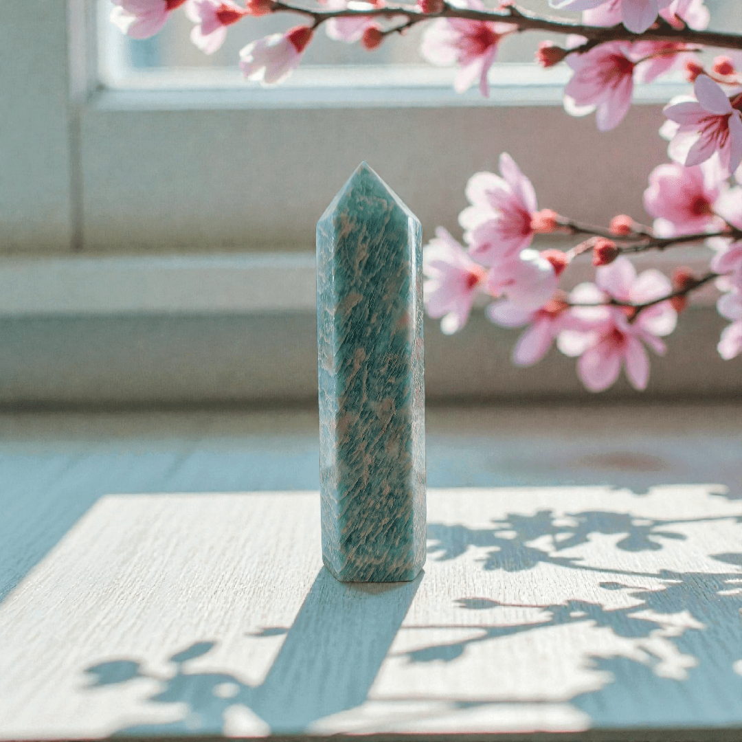 The Amazonite Crystal Tower is an emotional reset stone for the moments you’re overwhelmed, overthinking, or biting your tongue just to keep the peace. It supports calm, clear communication and helps you express what you actually mean—without the guilt spiral after. If you tend to people-please, over-explain, or carry everyone else’s feelings, Amazonite is the kind of steady energy that helps you come back to your own truth.