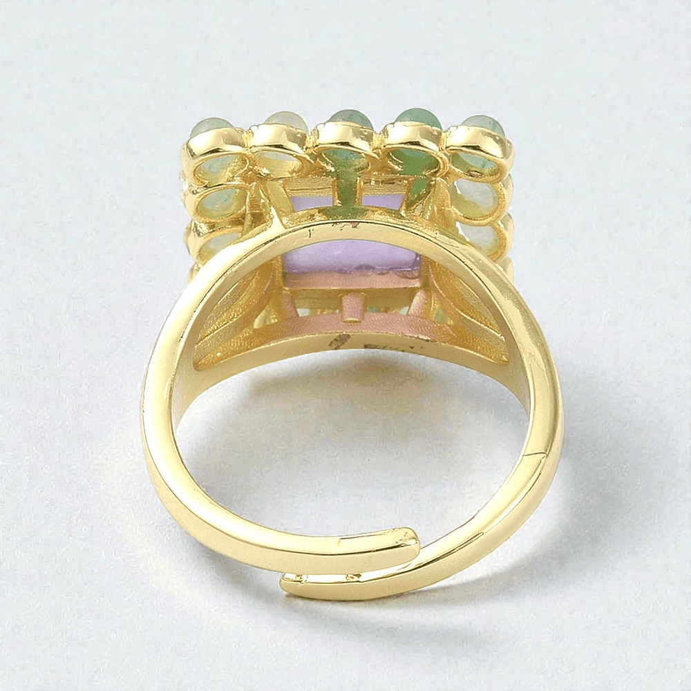 The rectangular Amethyst at the center acts as an anchor for awareness and perspective, helping quiet mental overwhelm. Surrounding Green Aventurine stones reinforce renewal and progress, creating a ring that supports thoughtful action rather than rushed decisions.