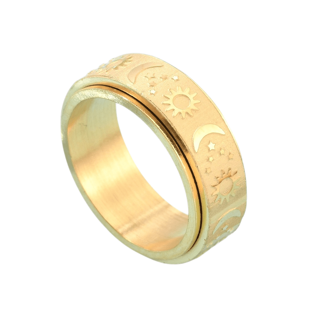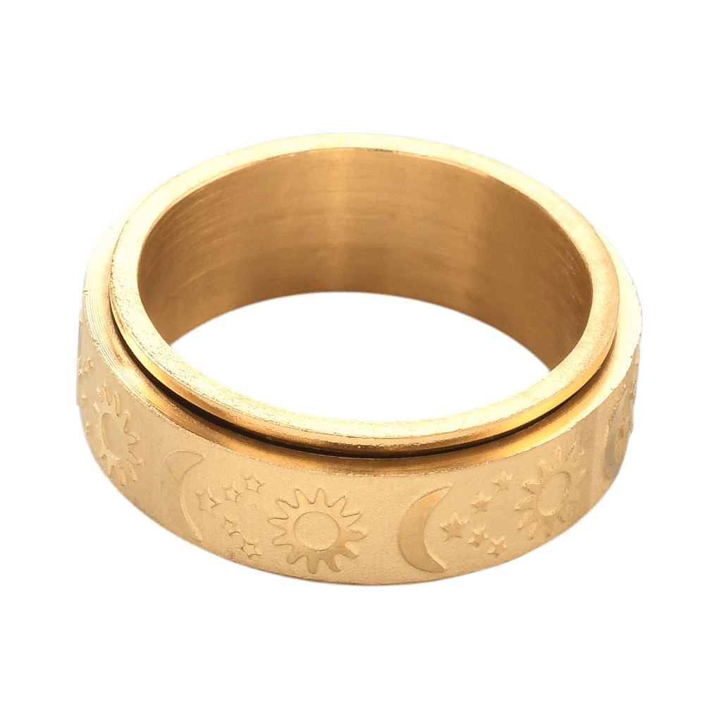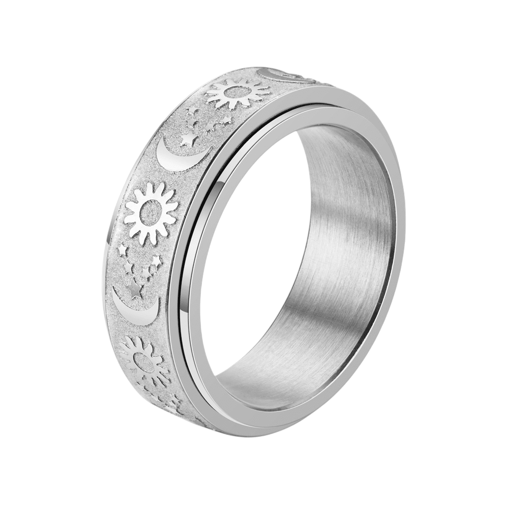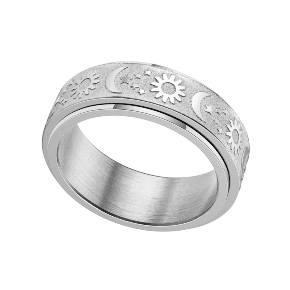 This ring features a rotating outer band engraved with celestial symbols — the sun, moon, and stars — representing balance, cycles, and steady presence. The spinning function offers a tactile outlet for restless energy, making it especially supportive during moments of anxiety, overthinking, or sensory overwhelm.