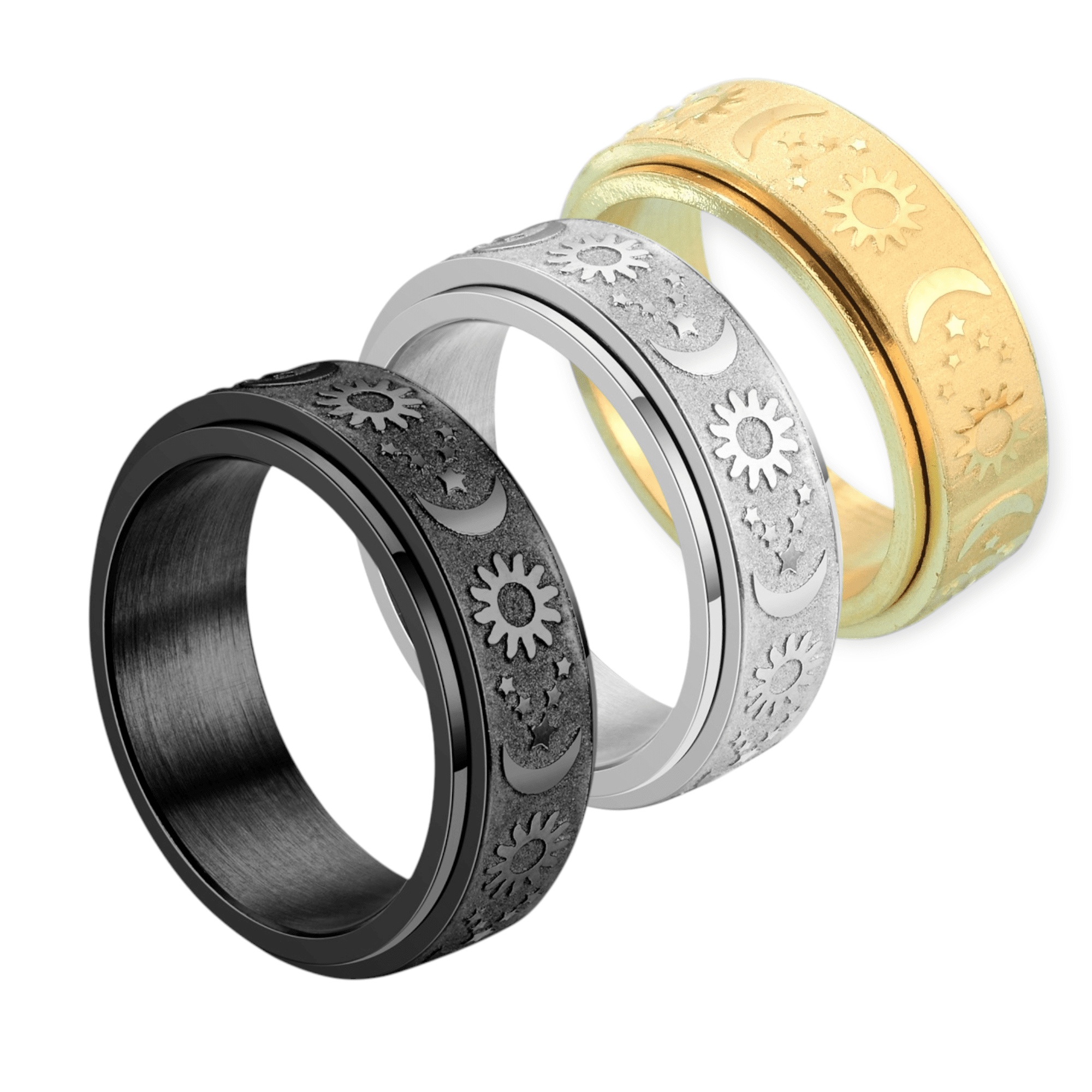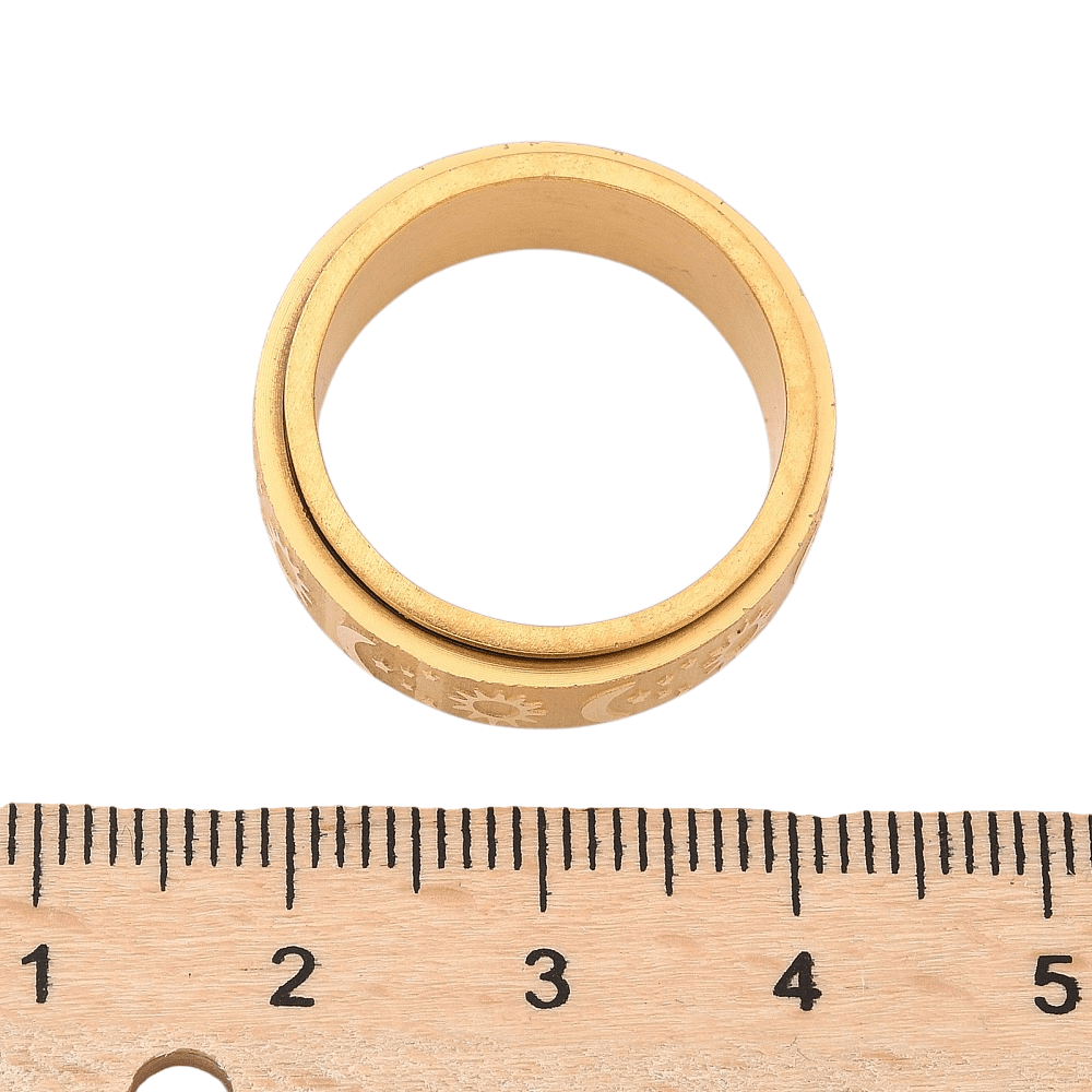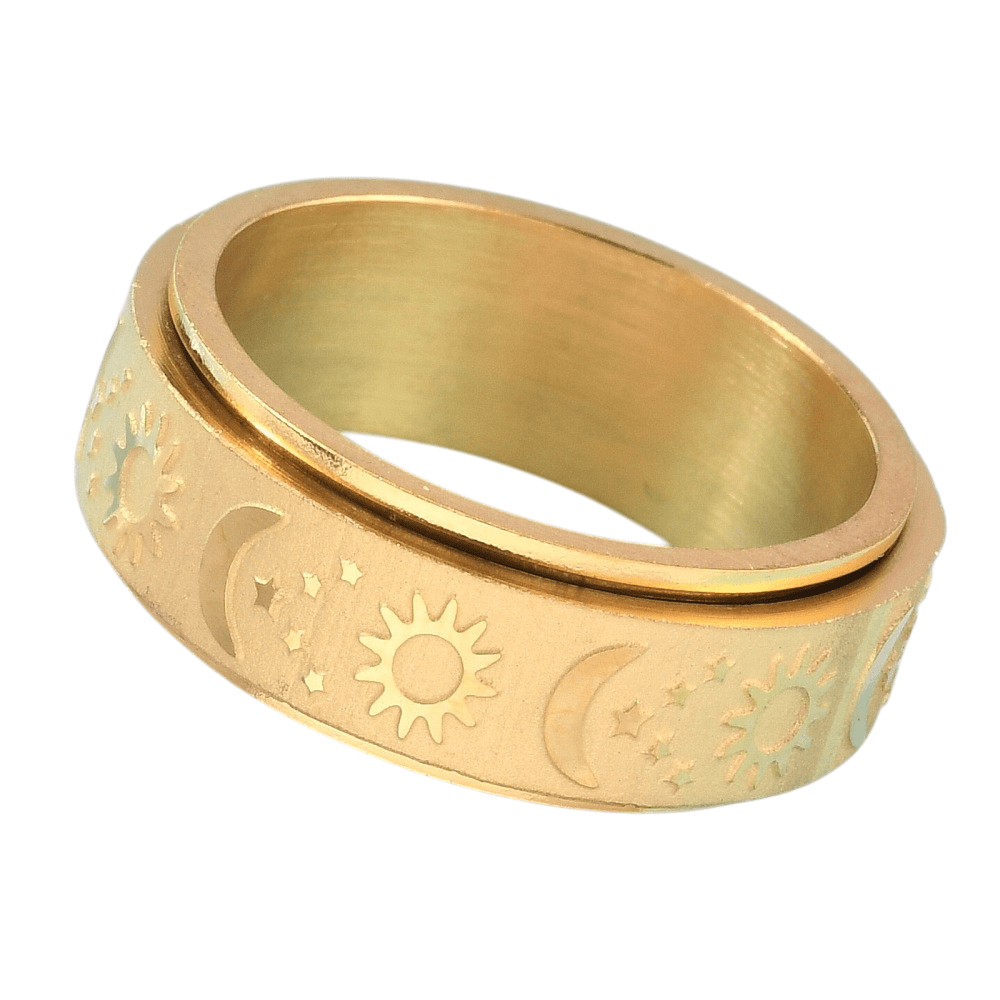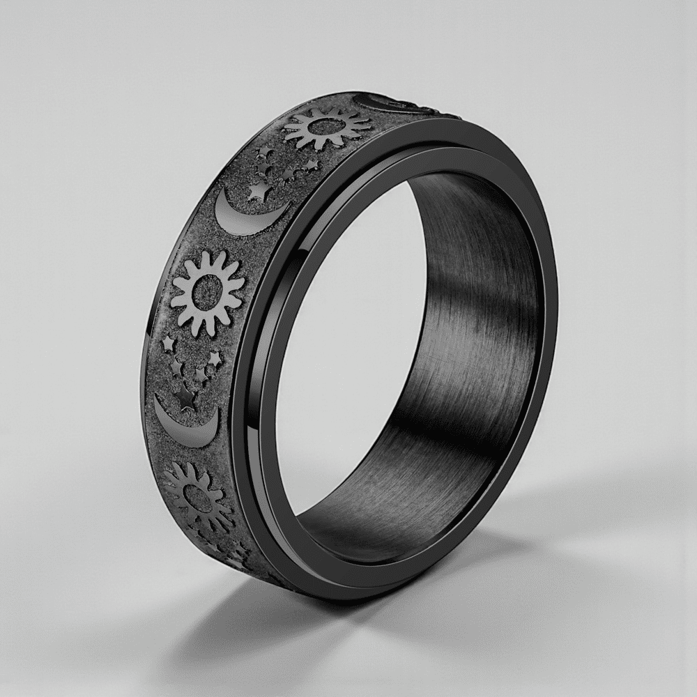 This ring features a rotating outer band engraved with celestial symbols — the sun, moon, and stars — representing balance, cycles, and steady presence. The spinning function offers a tactile outlet for restless energy, making it especially supportive during moments of anxiety, overthinking, or sensory overwhelm.