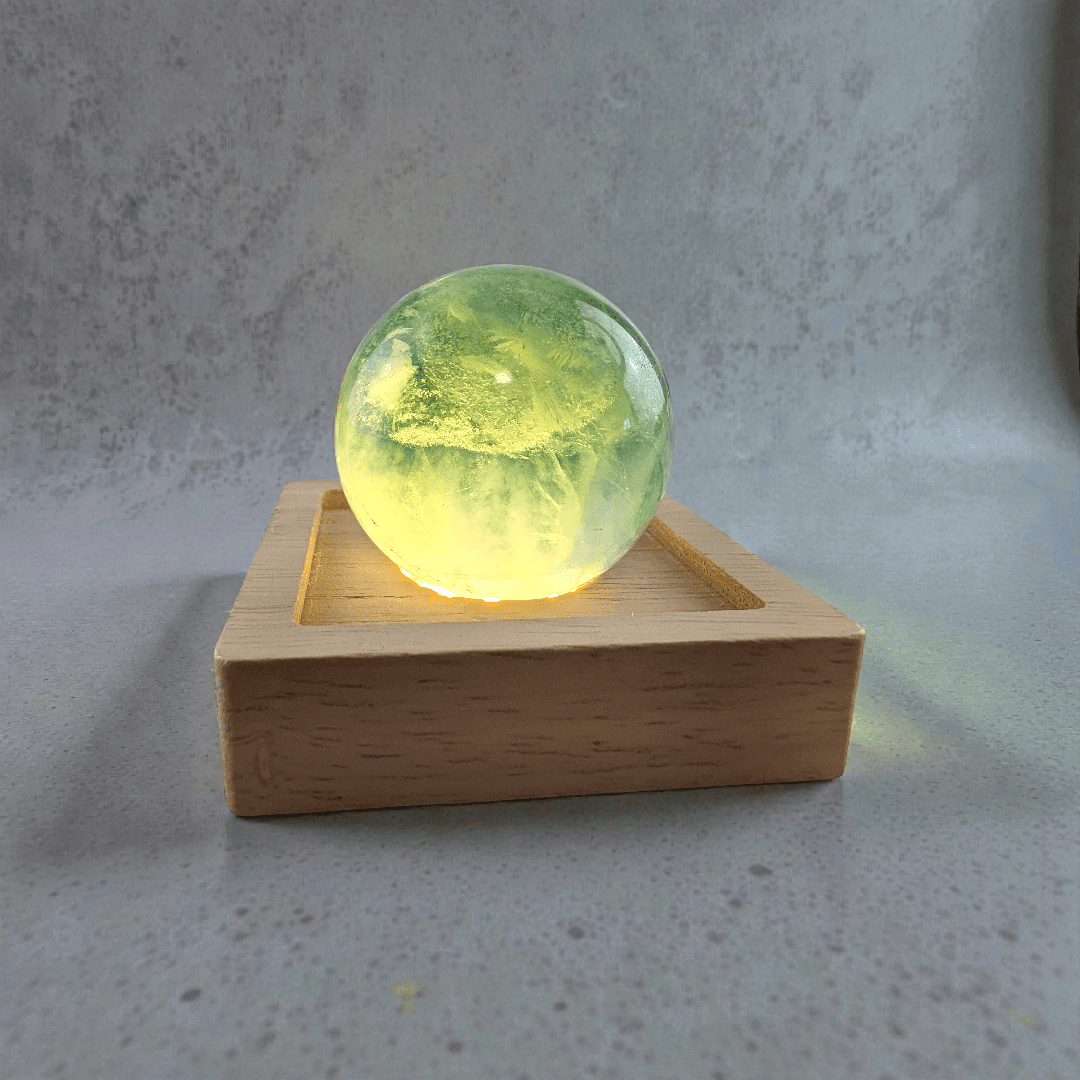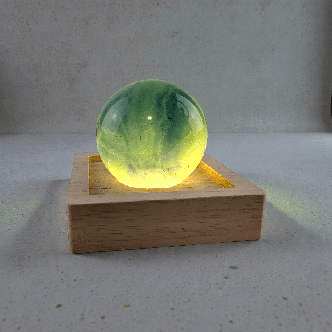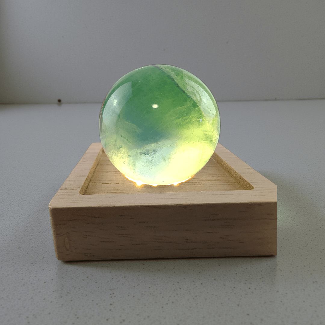 Each sphere is made from natural Fluorite, meaning color variations, banding, and internal inclusions are normal and expected. No two crystals are the same, making your piece entirely one of a kind. You’ll notice its natural inclusions, slight color variations, and unique energy, all contributing to the beauty of owning a raw piece of Earth’s magic. As you can see the sphere is transparent on the light but when taken off it looks much darker. The light or stand is not included.