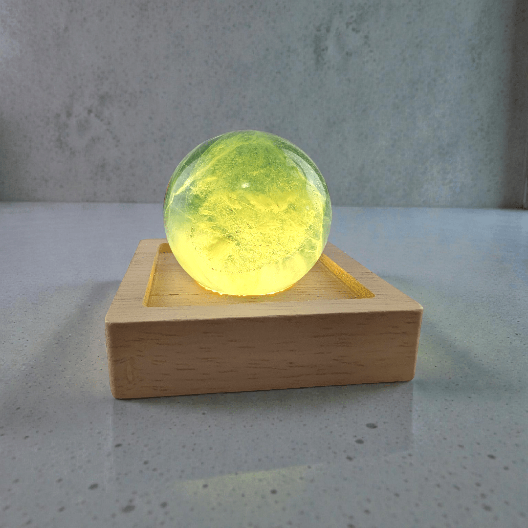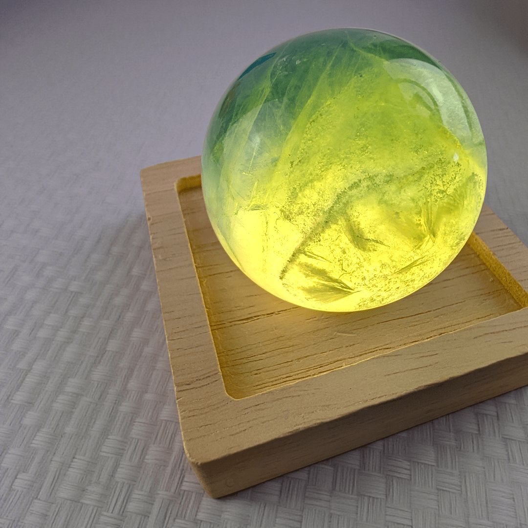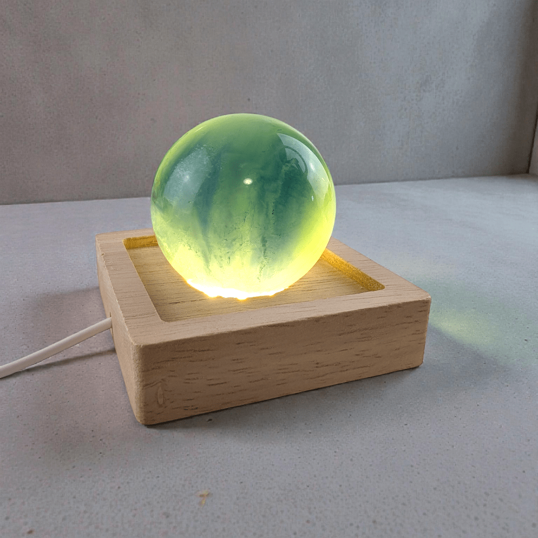 Each sphere is made from natural Fluorite, meaning color variations, banding, and internal inclusions are normal and expected. No two crystals are the same, making your piece entirely one of a kind. You’ll notice its natural inclusions, slight color variations, and unique energy, all contributing to the beauty of owning a raw piece of Earth’s magic. As you can see the sphere is transparent on the light but when taken off it looks much darker. The light or stand is not included.