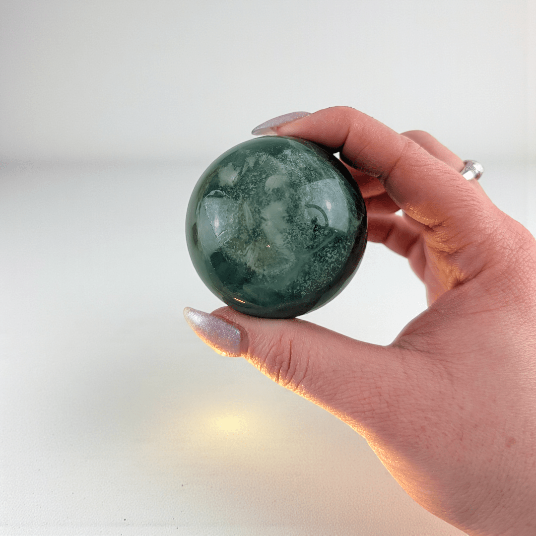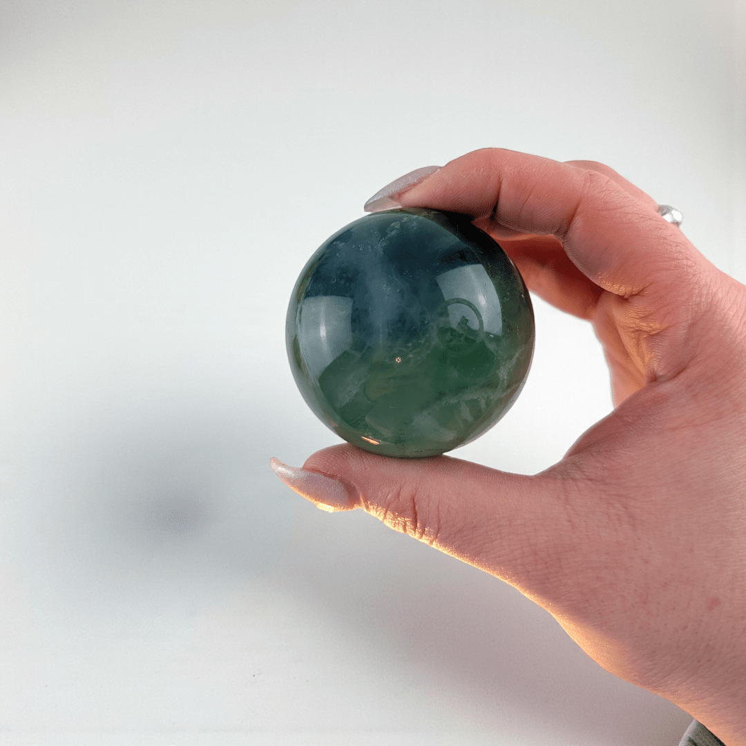 This Fluorite sphere works beautifully as a grounding focal point on its own or alongside other supportive tools from our Crystal Sphere Collection.