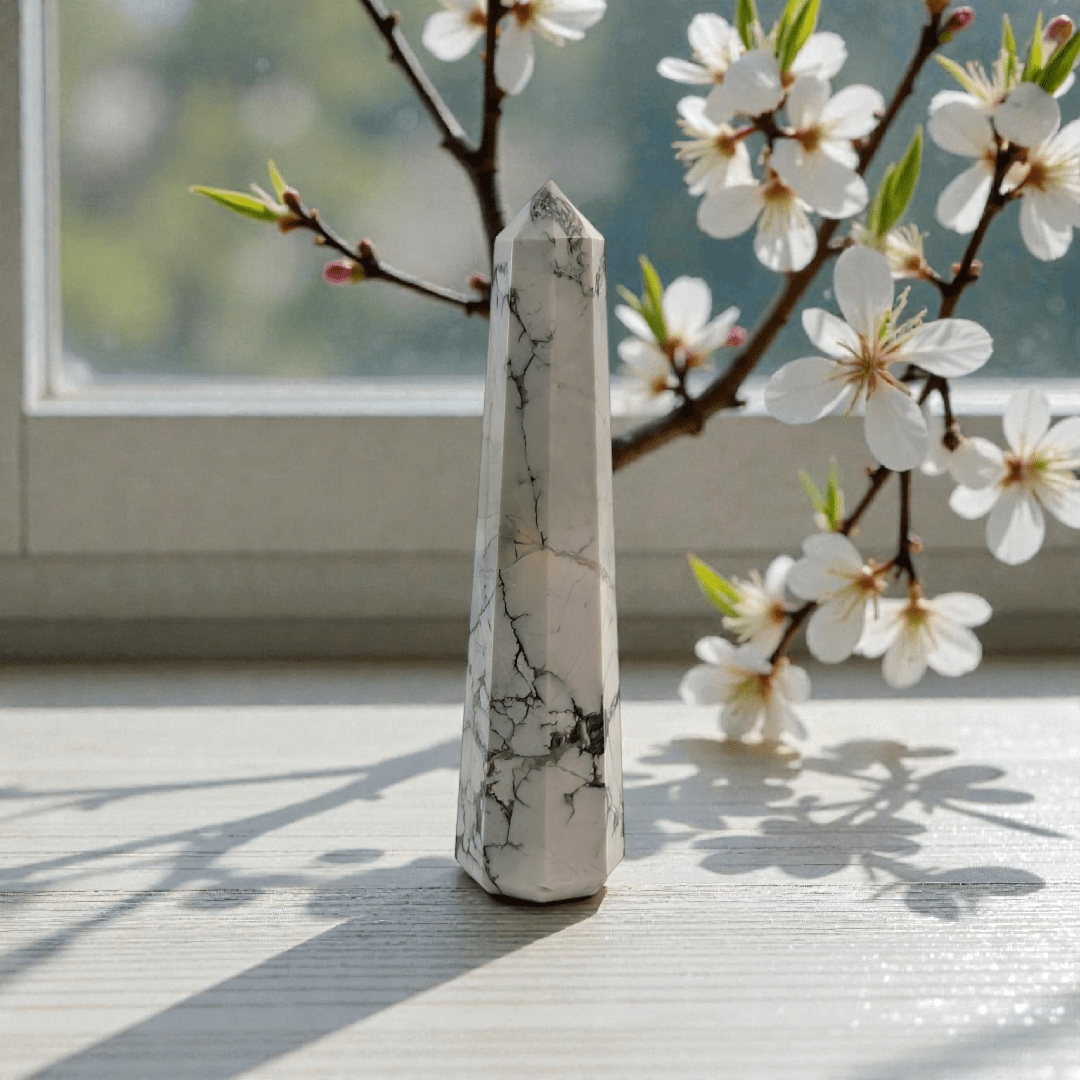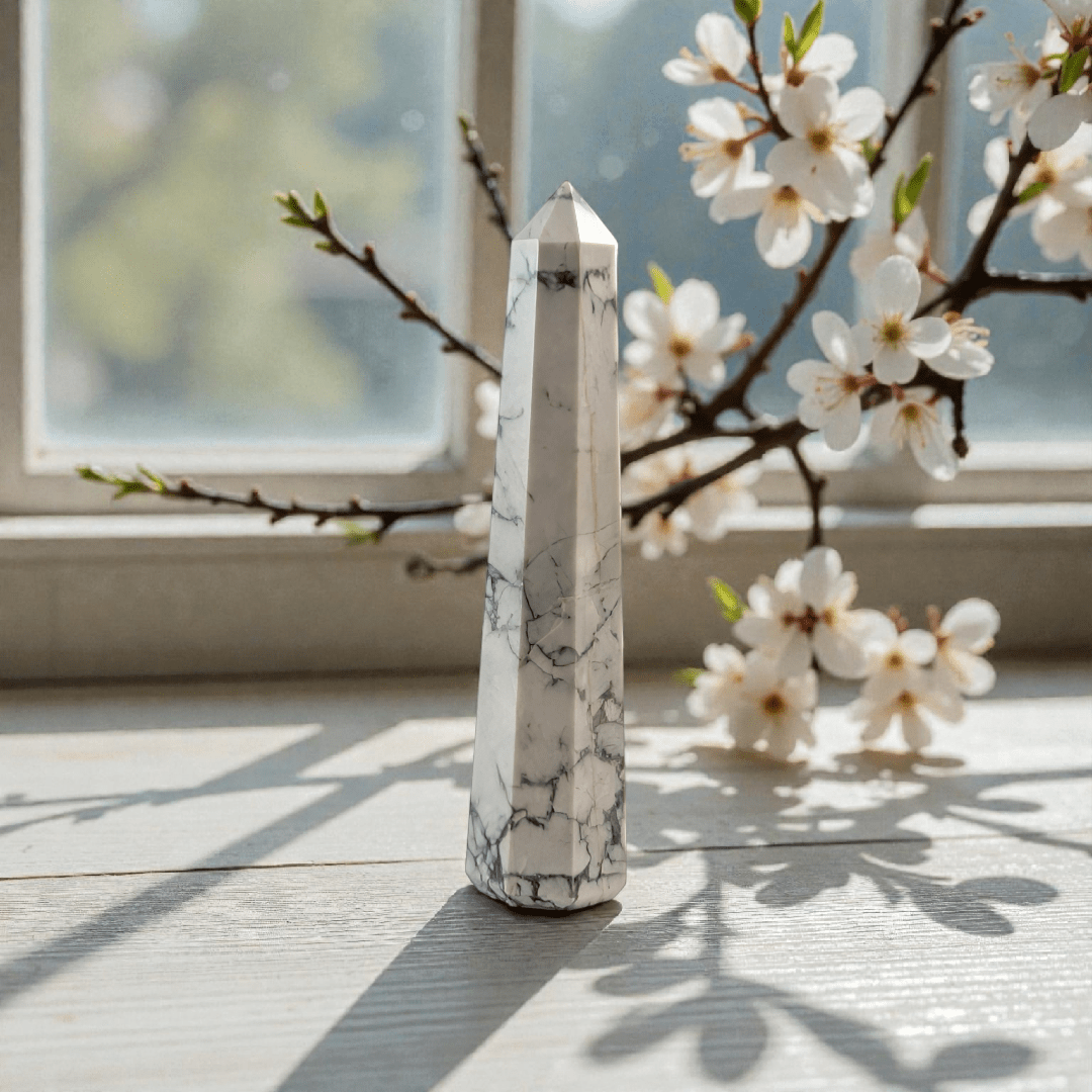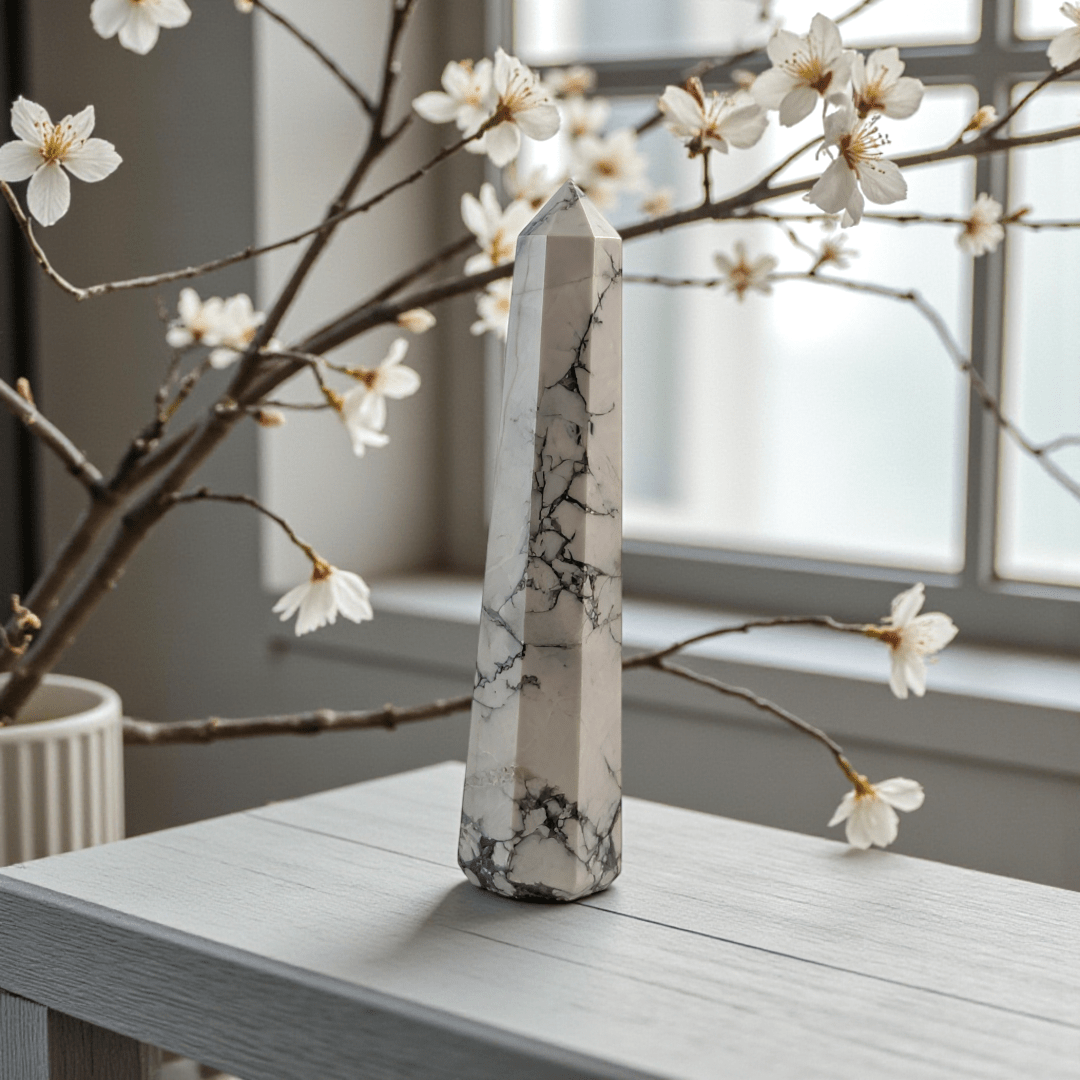 The Howlite Crystal Tower is best known for supporting emotional regulation, patience, and calming reactive thoughts. This stone is especially helpful for those who feel easily overwhelmed, mentally overstimulated, or quick to react under stress. Howlite works by slowing the mind and helping you respond thoughtfully instead of emotionally.