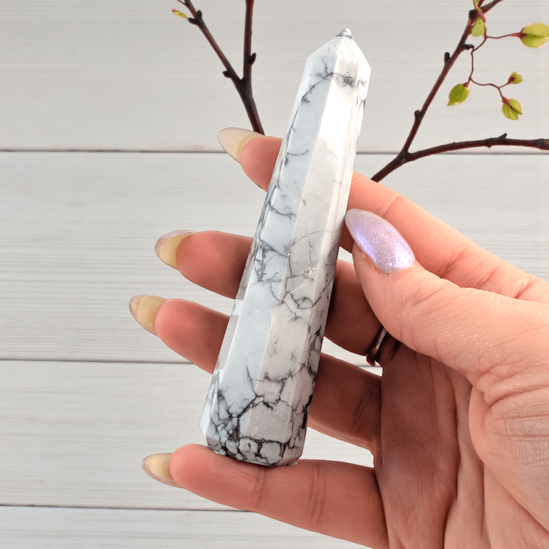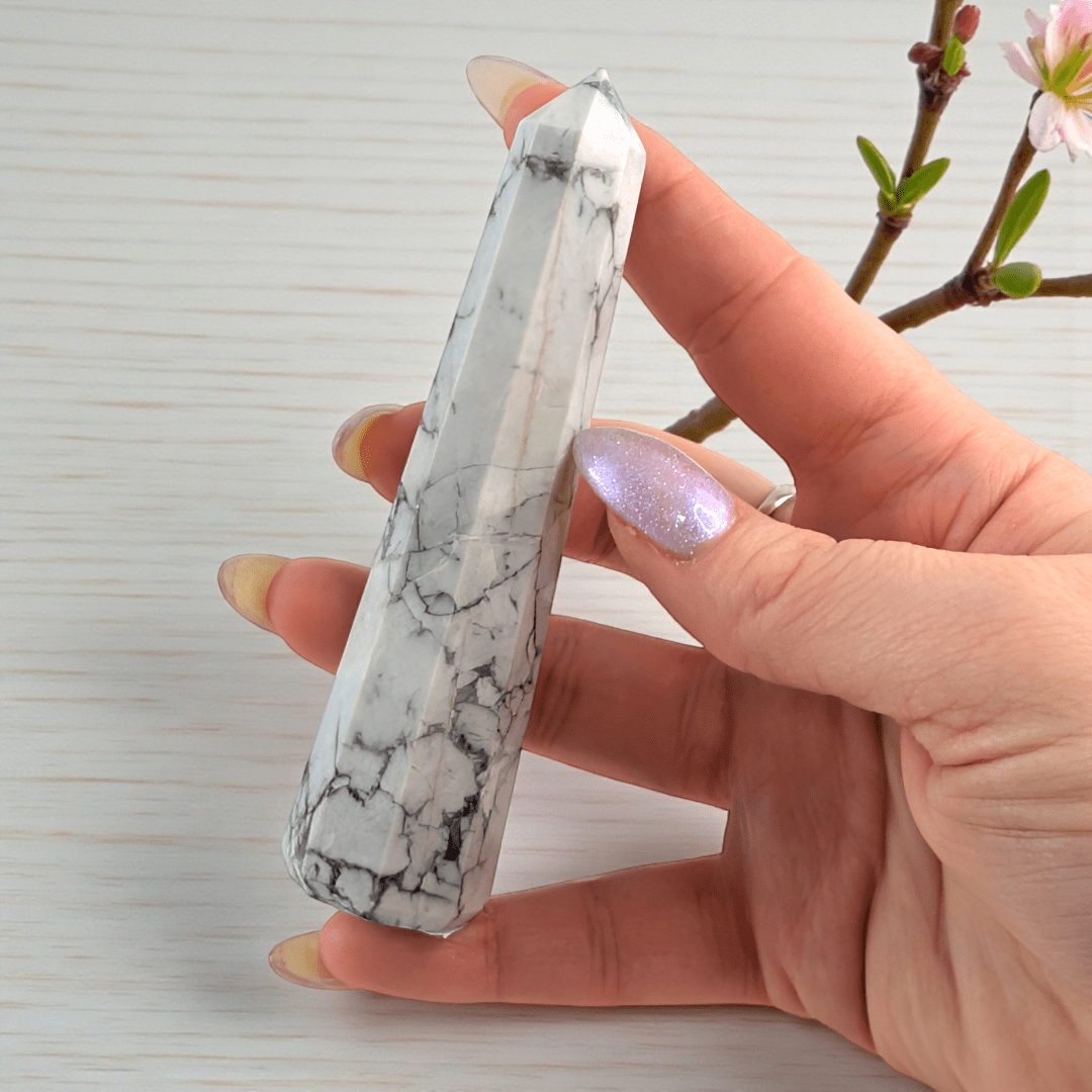 You will receive the exact Howlite Crystal Tower shown. Natural veining, surface textures, and color variations are expected and are a testament to the stone’s authenticity. Color may appear slightly different depending on screen settings.
