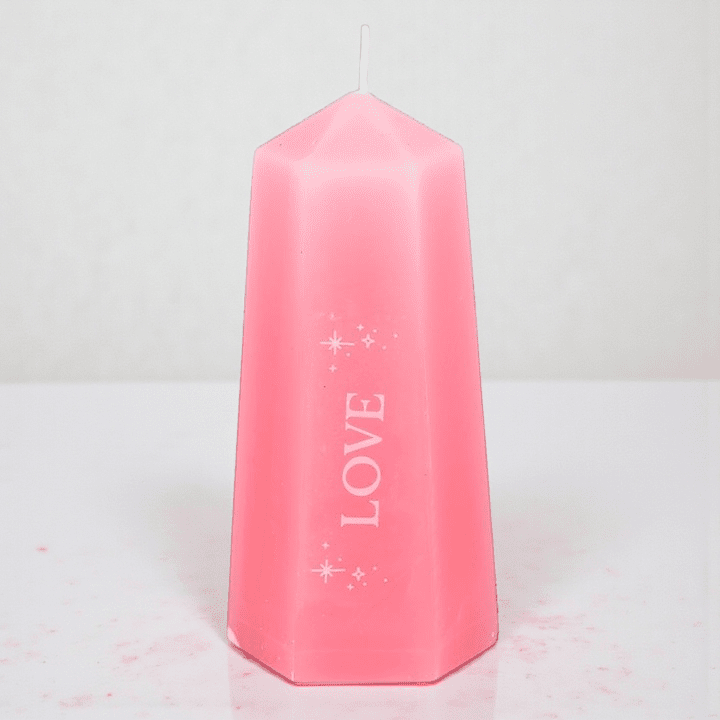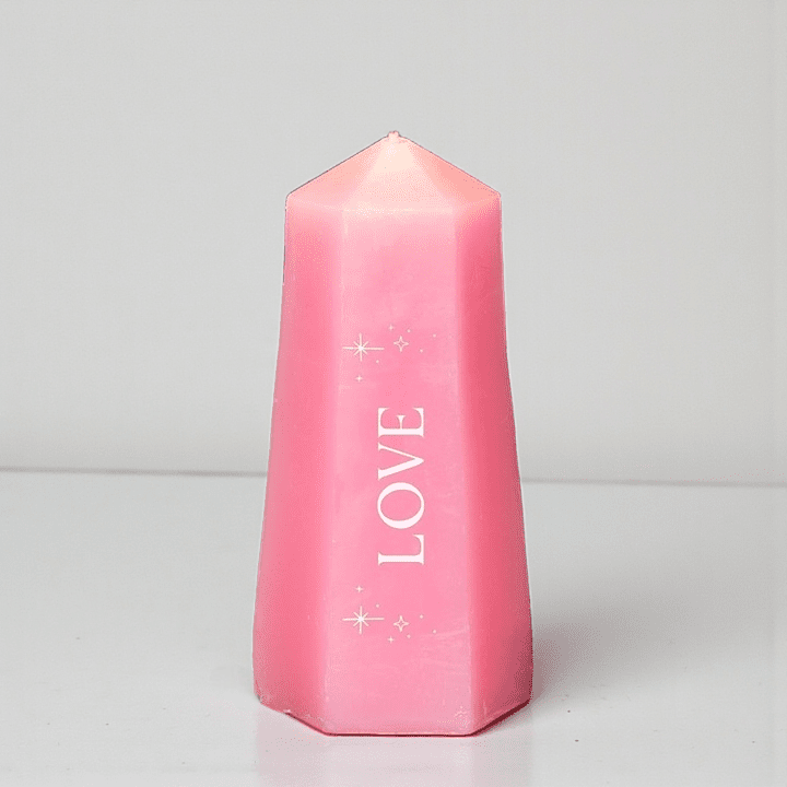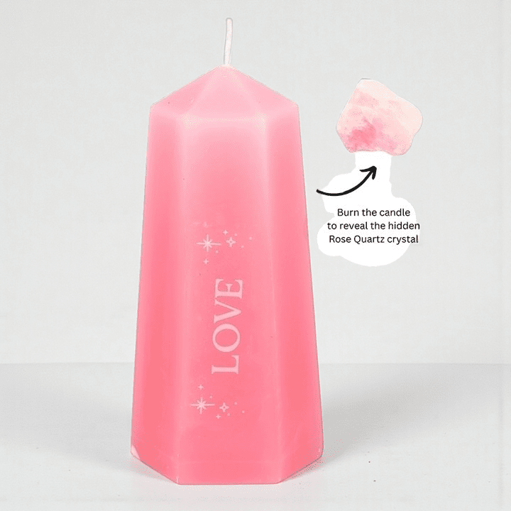 The Pink Love Candle with Rose Quartz Crystal is designed to be both ritual and reward. Shaped like a soft pink crystal tower, this candle invites intention-setting, patience, and presence—burning slowly to reveal a rough rose quartz crystal hidden at the base.